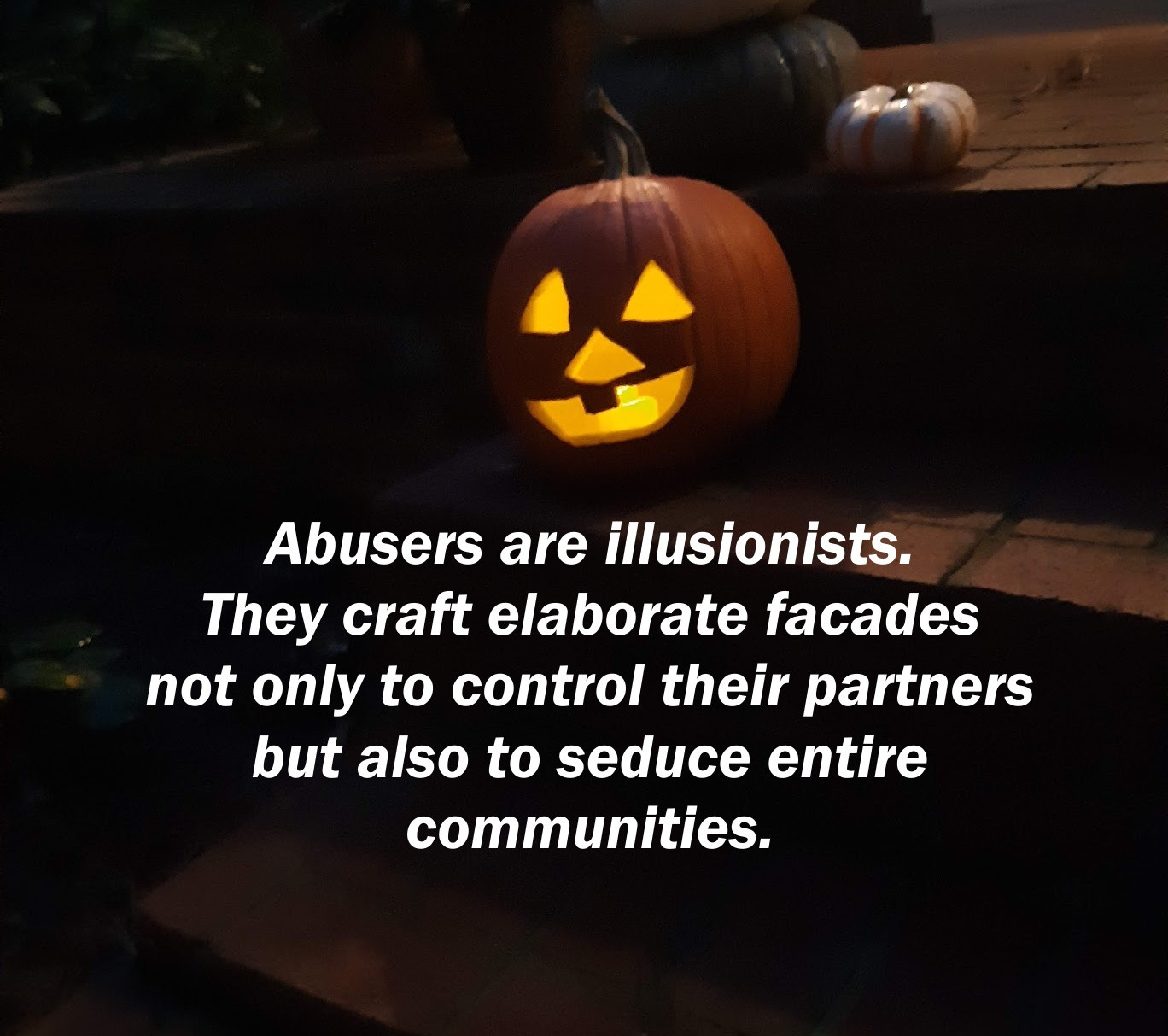 Abusers are illusionists. They craft elaborate facades not only to control their partners but also to seduce entire communities. They build sets so convincing that neighbors, friends, even family applaud the performance. And we, all of us, play along until hopefully the mask slips and the specter behind it is revealed.